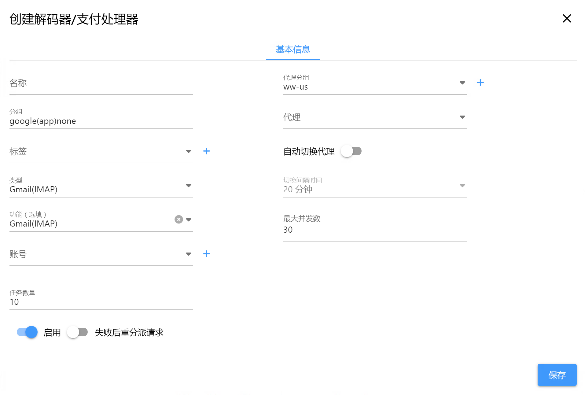 创建邮件源imap功能任务，这种任务不是登录一个邮件获取转发邮件，而是支持每一个账号各自登录imap邮件来获取验证码点击link等服务。